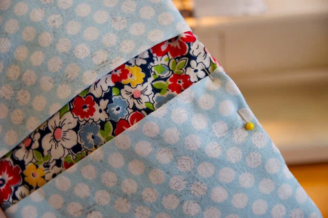 Poke those corners out good with a chopstick (or whatever) and press it good, pressing your opening closed. I then place a pin in my opening, ready for top stitching. I don't bother hand sewing that opening, because it will be closed up with the top stitching.