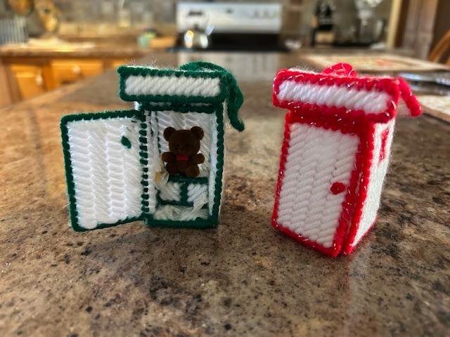 Plastic Canvas Outhouses from our listener Beverly